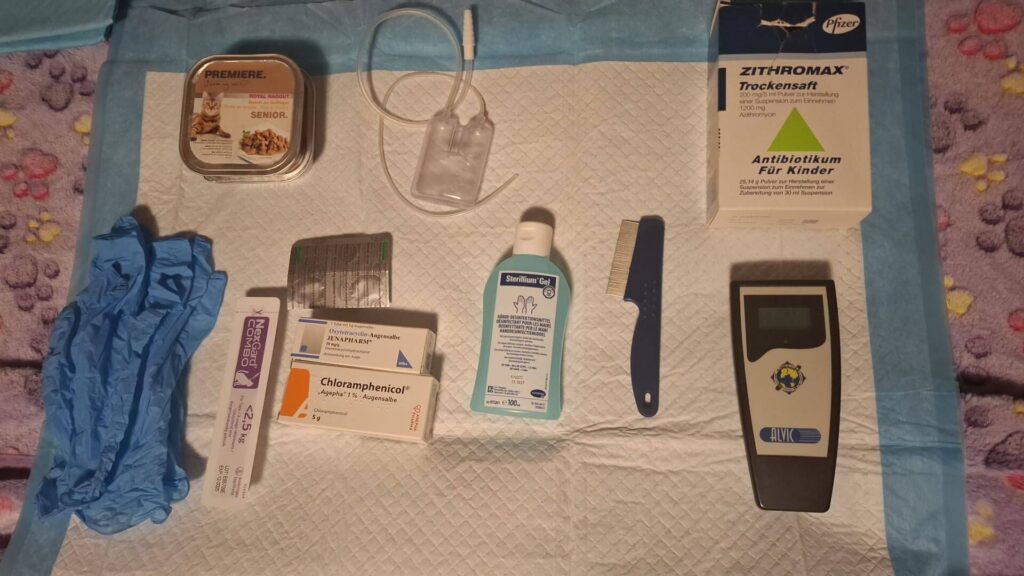 Hier zum Beispiel eine Halbwuchs Katze die sich unter einer Treppe eingenistet hat und neben Katzenschnupfen wohl etwas mit der Lunge zu haben scheint, sie röchelt.