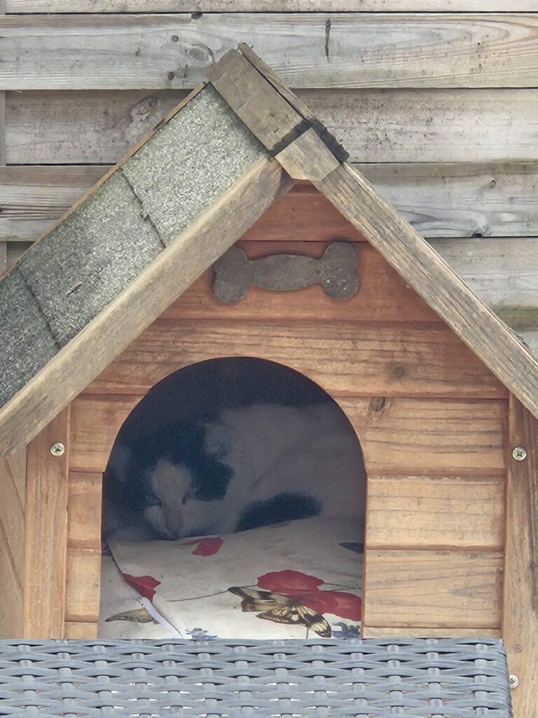 Bei der Melderin ist sie seit ca 1 Woche in der Hundehütte, die sie liebevoll mit Polster und Decken ausgelegt hat.❤️